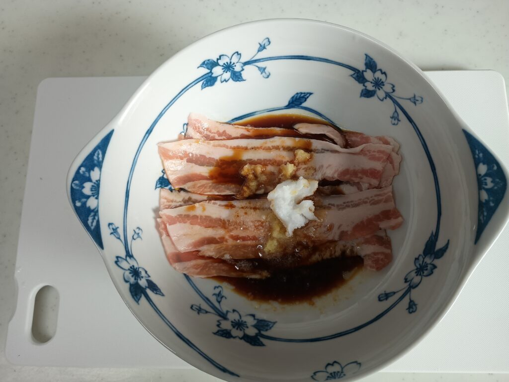 丼に豚バラ肉・すりおろしニンニク・ラードを入れてください。