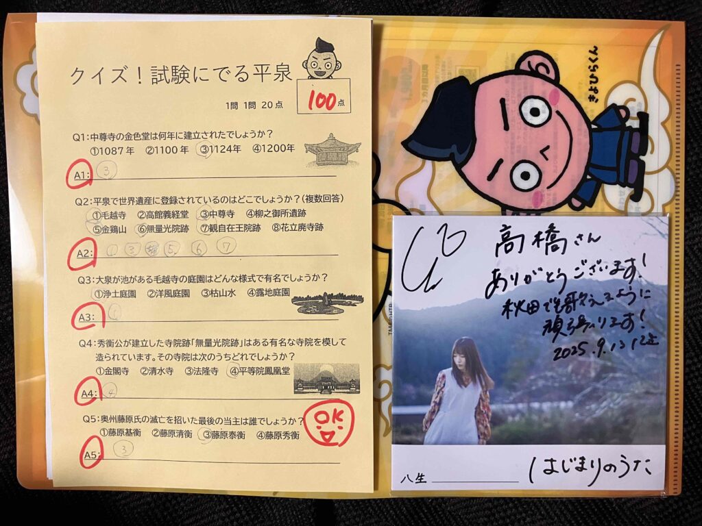 一日中、雨の中ではありましたが、キャラバンと、寺院巡り(クイズ!試験にでる平泉、平泉町内絵はがきの旅)も楽しませていただきました。ありがとうございました。